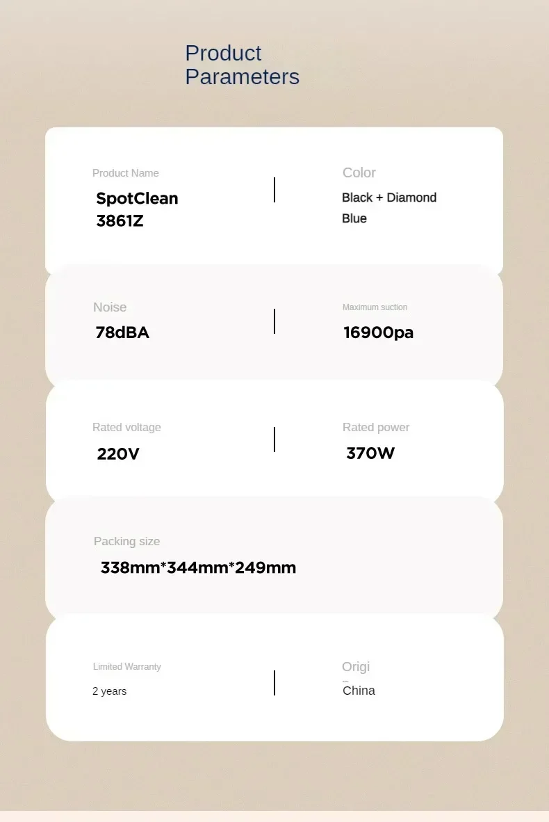 Hign-concerned Chemical : None Voltage (V) : 220V Power (W) : <500w Function : Wet and Dry Brand Name : Esyhey Origin : Mainland China brand : BISSELL Model : 3861Z Maximum noise : 78.3dBA Special nozzle type : Flat nozzle 3C certificate number : 2024010708614383 Sewage tank capacity : 819ml Maximum suction power : 16900Pa function : wet and dry Fabric cleaning machine type : Household wired Water tank capacity : 930ml Body weight (including battery) : 3.8kg Line length : 4.3m power : 370W