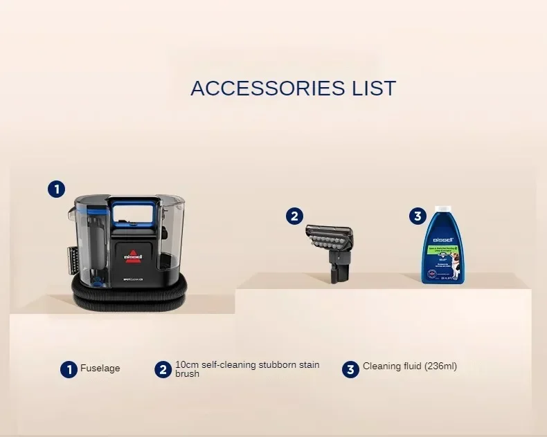 Hign-concerned Chemical : None Certification : ce Voltage (V) : 220V Power (W) : <500w Function : Wet and Dry Brand Name : Esyhey Origin : Mainland China brand : BISSELL Model : 3861Z Maximum noise : 78.3dBA Special nozzle type : Flat nozzle 3C certificate number : 2024010708614383 Sewage tank capacity : 819ml Maximum suction power : 16900Pa function : wet and dry Fabric cleaning machine type : Household wired Water tank capacity : 930ml Body weight (including battery) : 3.8kg Line length : 4.3m power : 370W